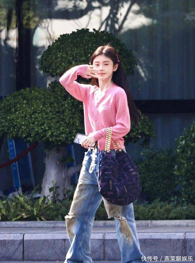 秋天穿衣服真的是个“技术活”——想保暖怕显臃肿,想好看又怕太刻意,早上对着衣柜发呆简直是常态。但鞠婧祎这一身搭配,算是把秋日穿搭的“平衡感”玩明白了,甜和野居然能揉得这么自然。粉色圆领针织衫本来容易“踩雷”,要么颜色太艳像年画,要么材质太硬显老气,但她选的那种软乎乎的低饱和粉,像秋日晒过的水蜜桃,温温柔柔的,穿在身上自带“减龄滤镜”。可光穿粉色多单调啊?下装直接配条做旧破洞牛仔裤——破洞的毛边、泛着旧意的底色,像给甜丝丝的粉色撒了把“粗颗粒盐”,一下子把甜腻感中和掉了,反而带出点随性的野劲儿,就像奶茶里加了点咸奶盖,意外的清爽。